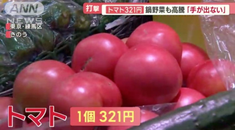 由于受到酷暑影响,日本蔬菜歉收,整体蔬菜飞涨,就连西红柿一个都要321日元,足足比平时高出3倍以上,不少人大呼:“太贵了!快要吃不起蔬菜了。”