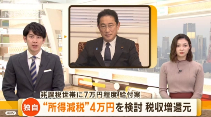 据日本朝日新闻24日报道,日本政府计划将增加税收的一部分返还给国民,对每个人的所得税减免4万日元的“定额减税”。